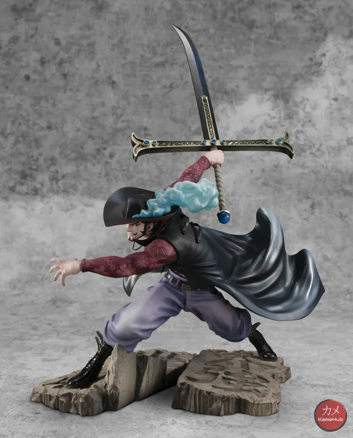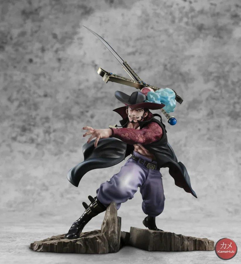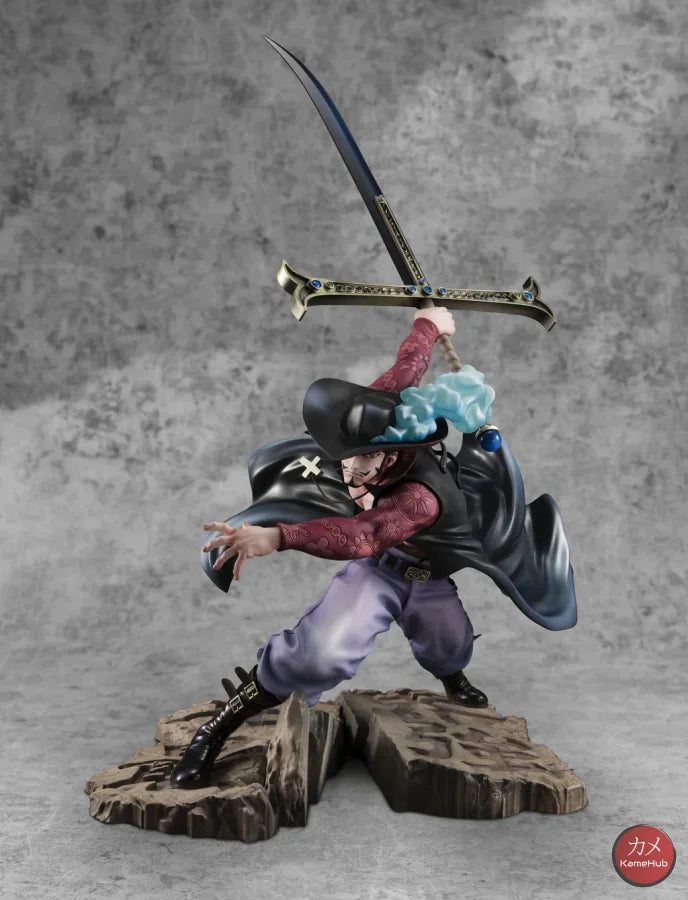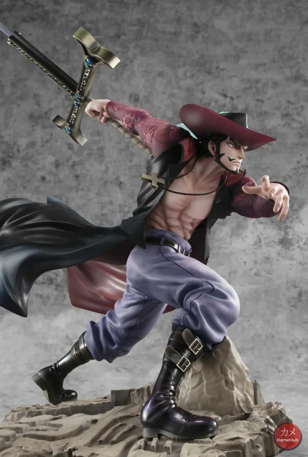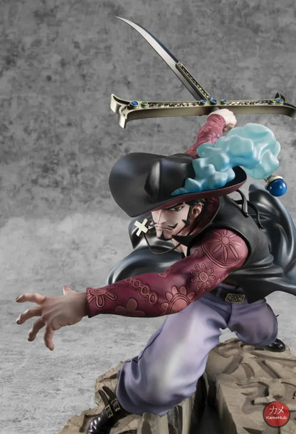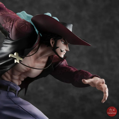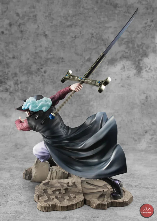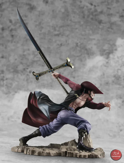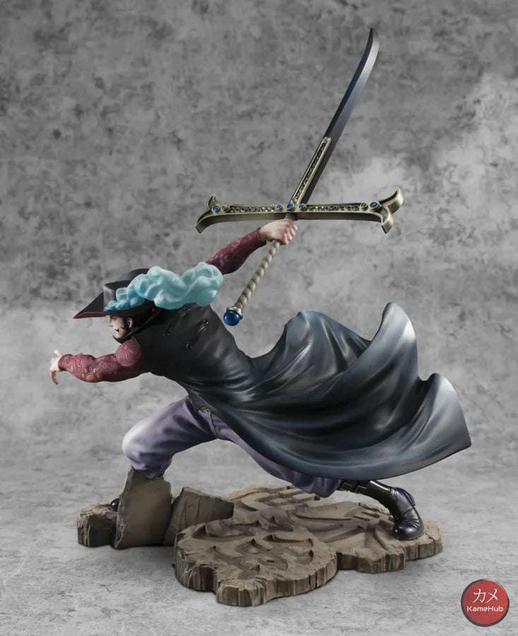The figure depicts Mihawk striking a blow with his master sword, "Yoru", in a dynamic and impressive scene that captures all the details of his unique design.