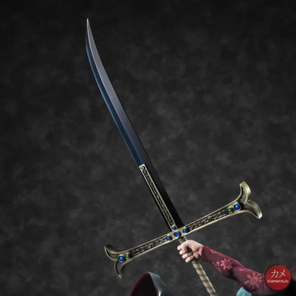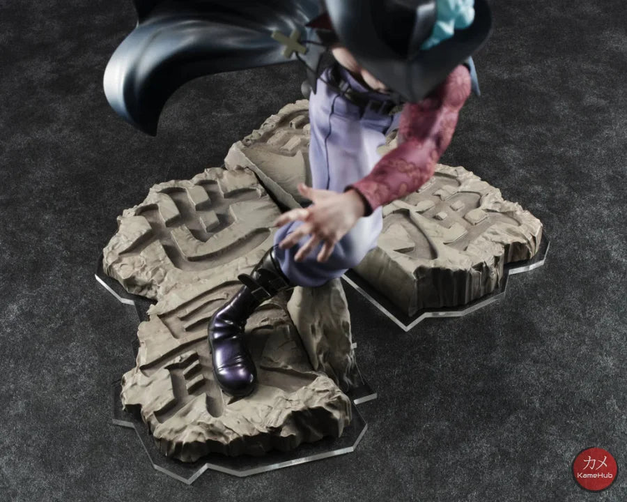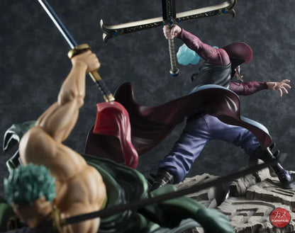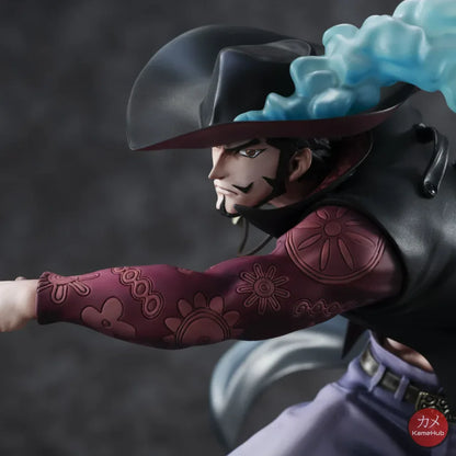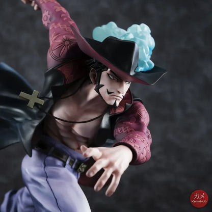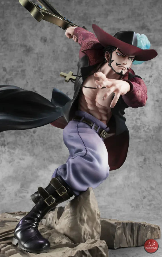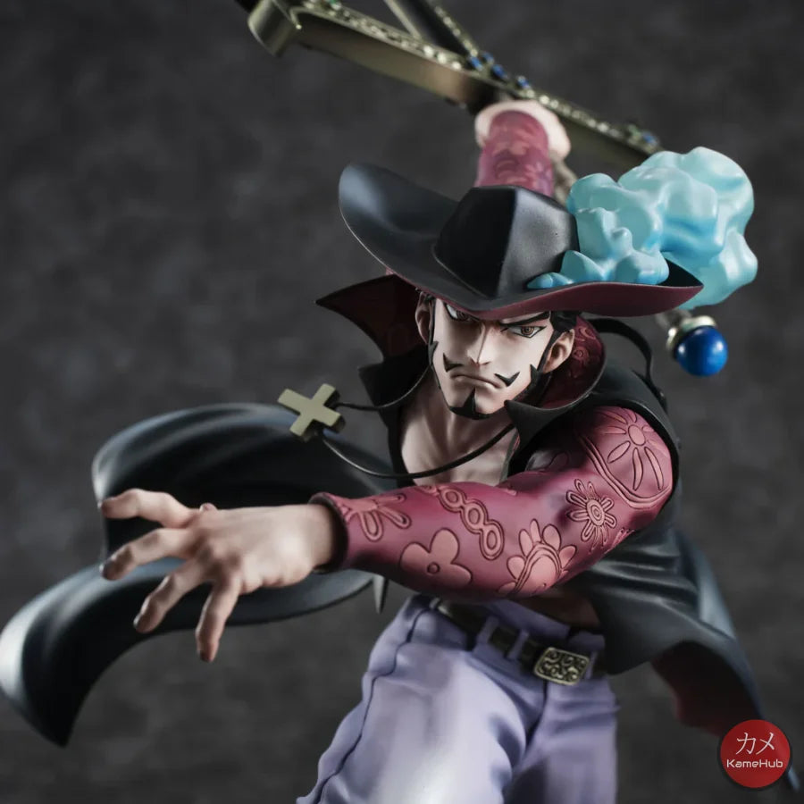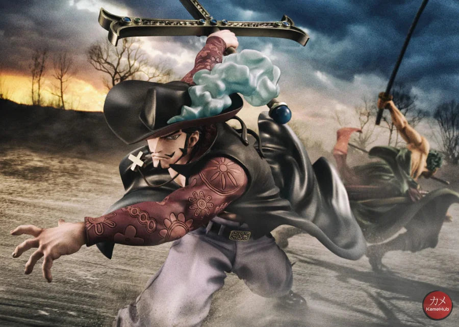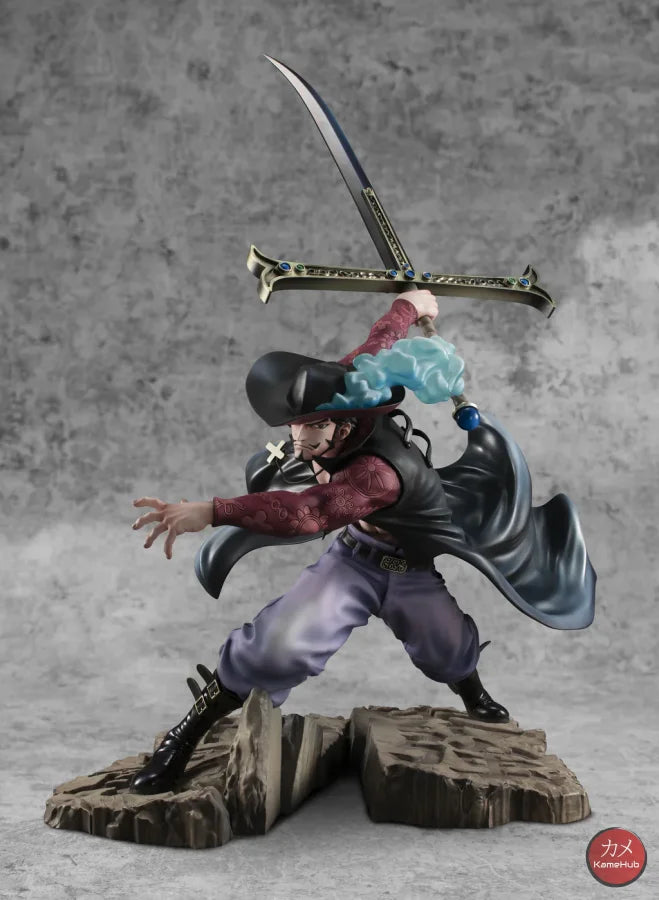 The figure depicts Mihawk striking a blow with his master sword, "Yoru", in a dynamic and impressive scene that captures all the details of his unique design.