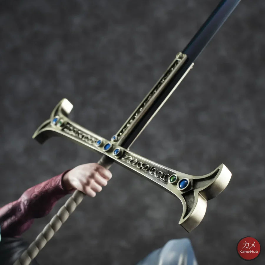 The figure is made of high quality PVC and ABS and reaches an incredible height of 34 cm taking into account the sword.