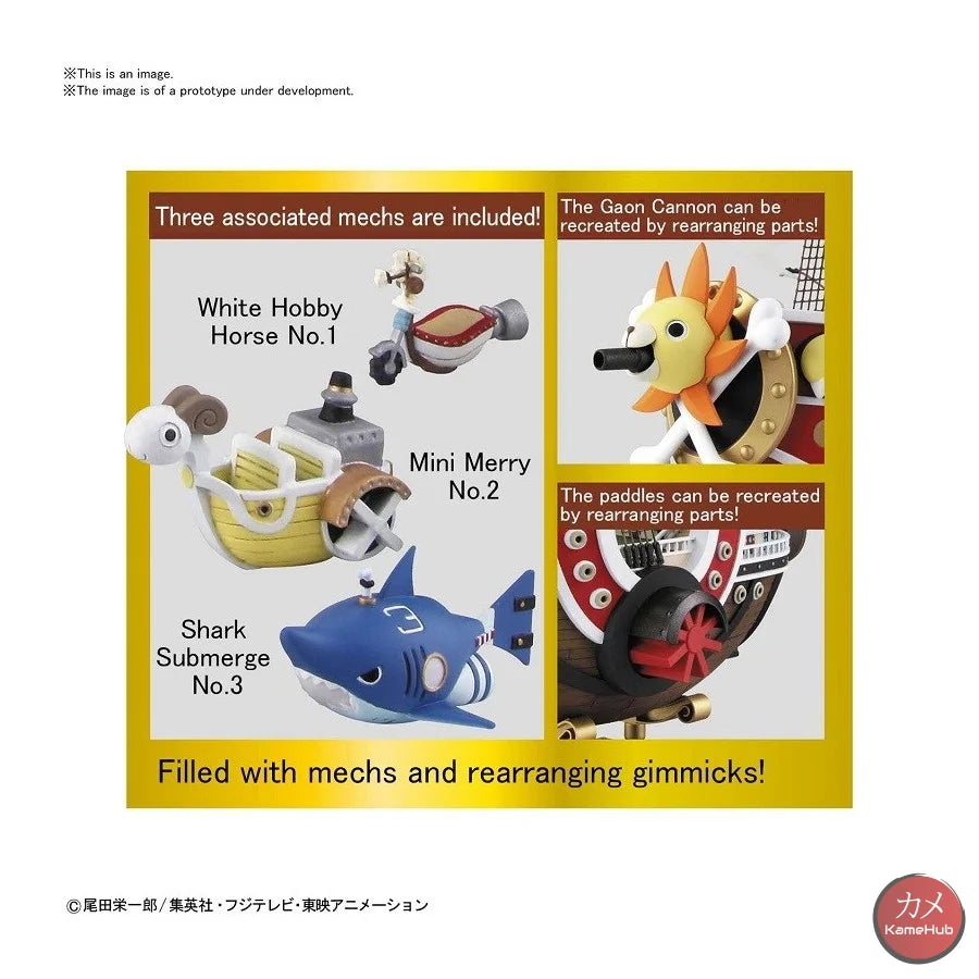 - 3 Mini Figures - Mini Going Merry, Submersible Shark and Shiro Mokuba (White Horse)
