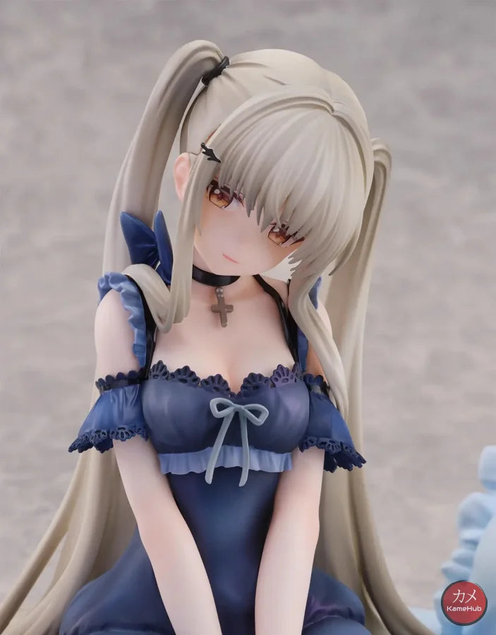 Mahiru's pose encapsulates all her charm and her sweet look creates a contrast with her dress and the devil-themed plush toy also because she hates her nickname "Angel"