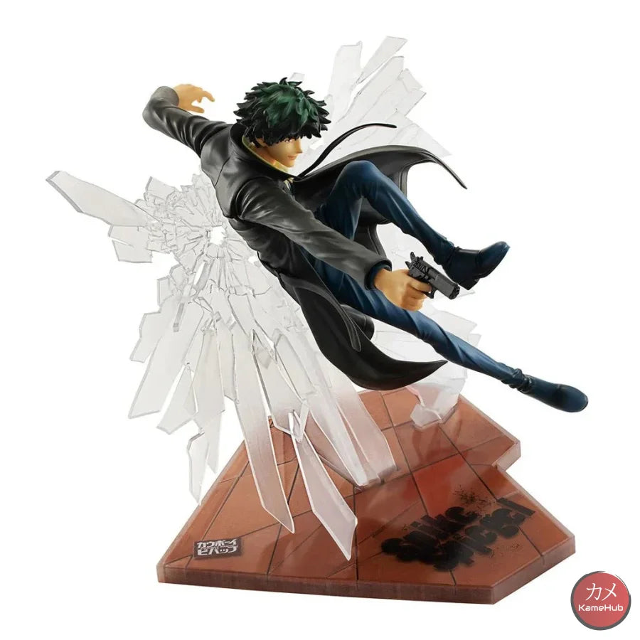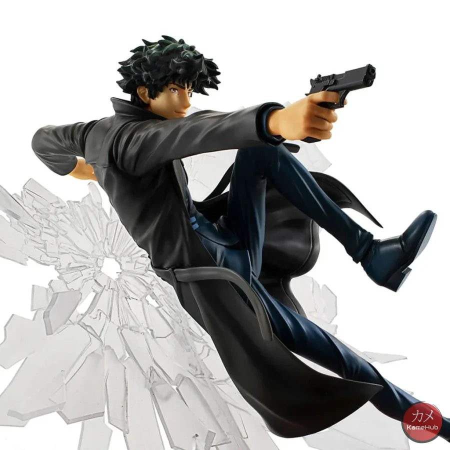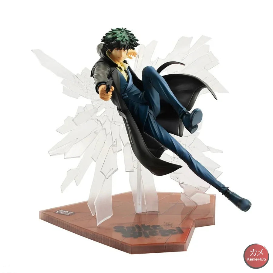 Spike Spiegel "Bounty Hunter" e Faye Valentine Immortalati in una posa dinamica nel mezzo di una sparatoria con lo specchio alle loro spalle che si infrange caratterizzato dal nome e logo dell'anime.